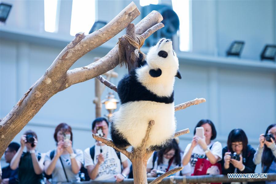 A baby giant panda plays on her one year old birthday at the Malaysian National Zoo near Kuala Lumpur, Malaysia, Jan. 14, 2019. The second giant panda born in Malaysia celebrated her first birthday at the Malaysian national zoo on Monday. The baby giant panda is the second offspring of her parents Xing Xing and Liang Liang who arrived in Malaysia in 2014. (Xinhua/Zhu Wei)