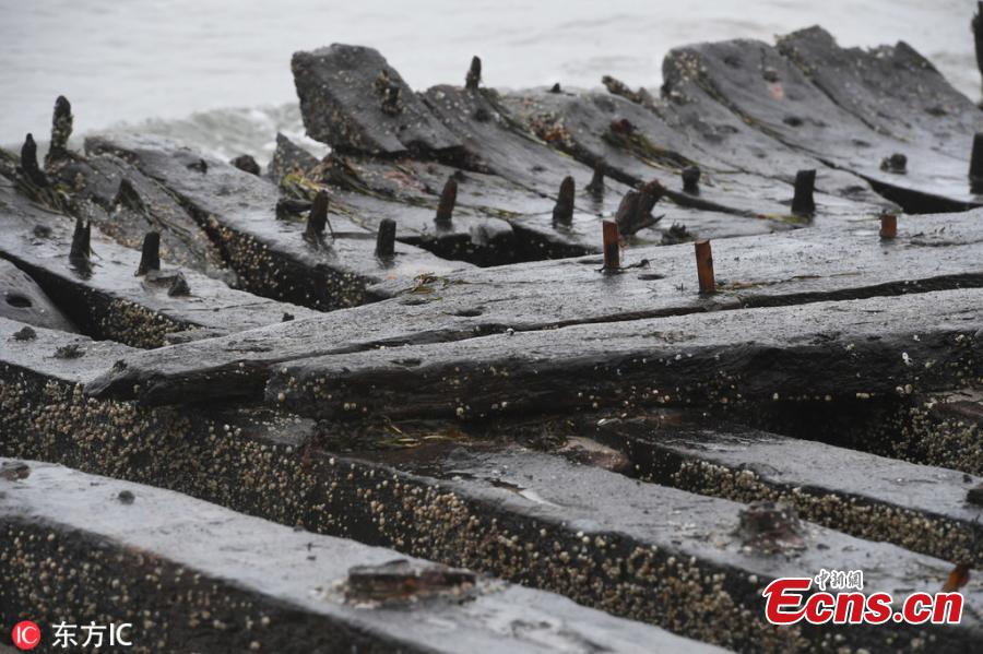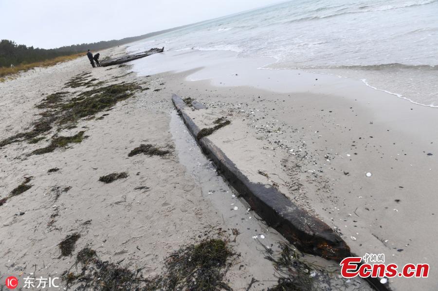 Photo taken on Jan. 15, 2019 shows the storm of the past few days has exposed an old shipwreck on the coast of the German island of Rügen. During the two storms in January, the beach in front of Glowe lost up to one meter of its height. According to experts, it is supposed to be a merchant ship from the 18th century due to its design. (Photo/IC)