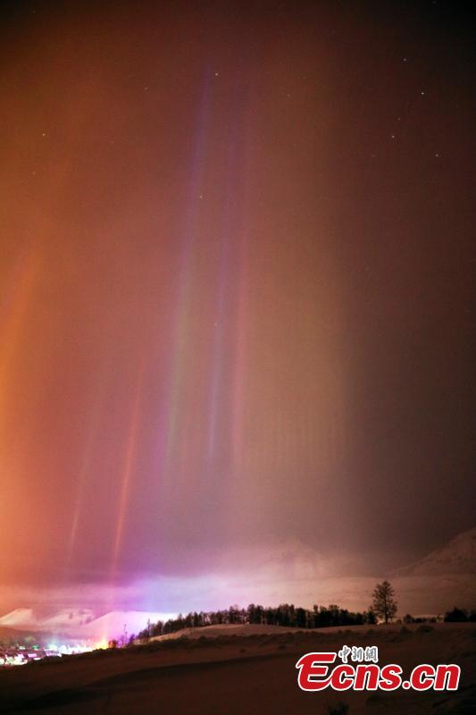 Natural light beam appears at Hemu Village, Altay, Northwest China's Xinjiang Uygur Autonomous Region as temperatures drop to 30 minus degrees. The sword-like light beam straight into the starry sky is a natural phenomenon, the reflection of ice crystals in the cold night air. (Photo: China News Service/Lei Dongxiang)
