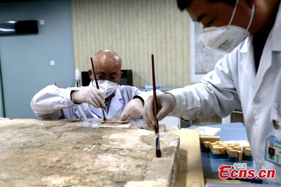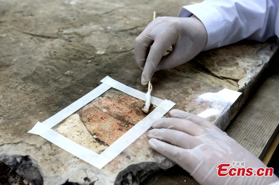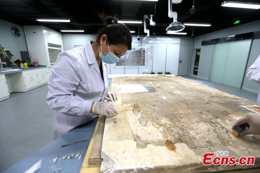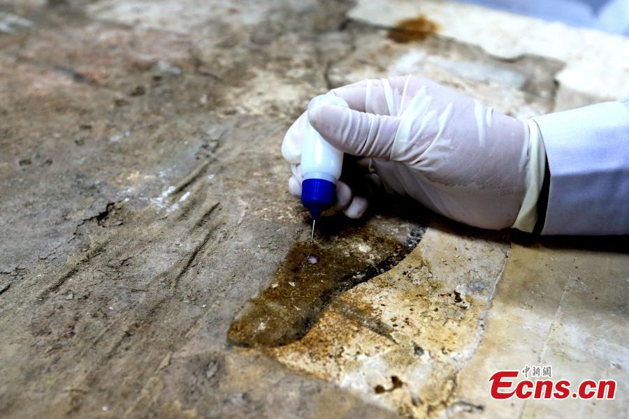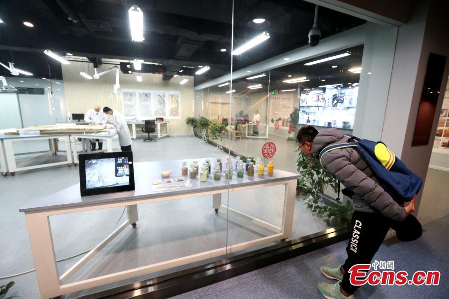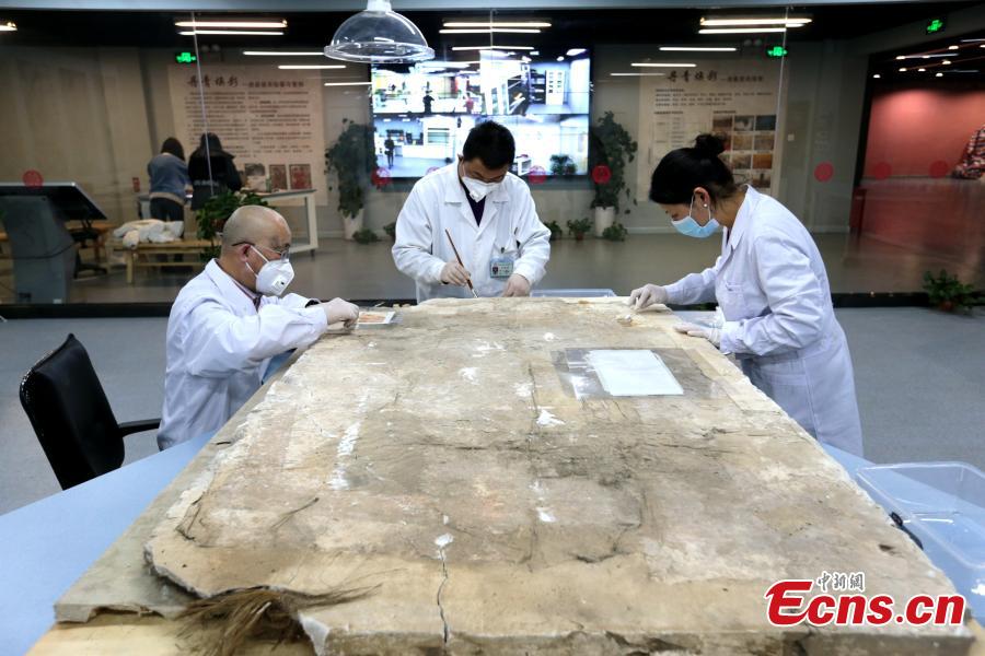An ancient mural undergoes restoration work in a room at the Shaanxi History Museum in Xi'an, Northwest China's Shaanxi Province, Jan. 16, 2019. Visitors can view the process through a glass window. (Photo: China News Service/Zhang Yuan)