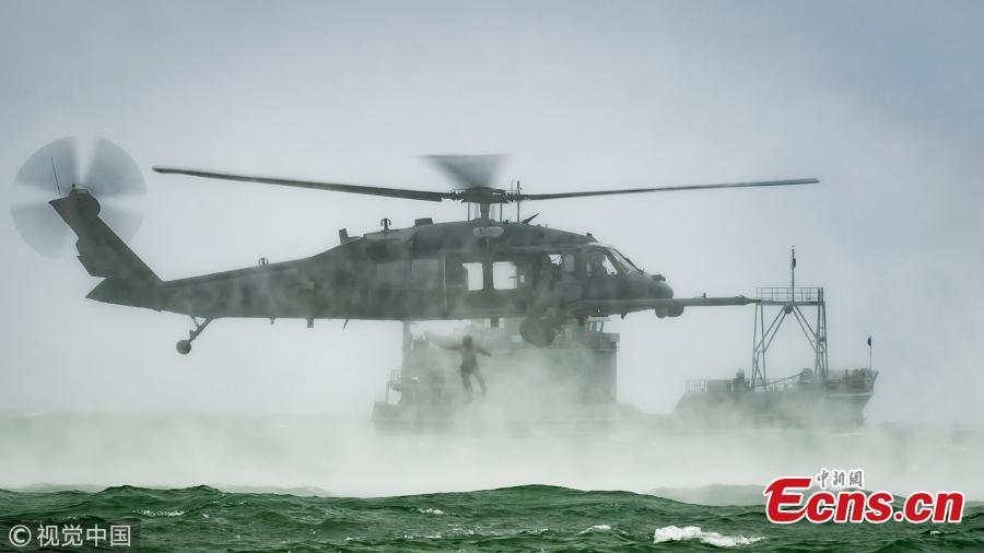 An Air Force Reserve pararescueman from the 920th Rescue Wing jumps out of an HH-60G Pave Hawk helicopter on May 26, 2018 during the 2nd annual Salute to American Heroes Air and Sea Show, in Miami Beach, Fla. (Photo/VCG)