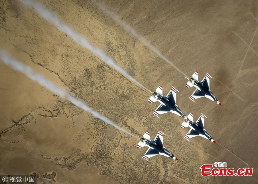 The Thunderbirds Diamond formation pilots perform the Diamond Roll maneuver over the Nevada Test and Training Range during a training flight, Feb. 28, 2018. (Photo/VCG)