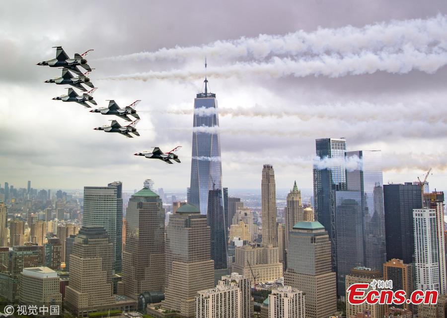 The Thunderbirds Delta formation performs a Pass in Review while flying past the Freedom Tower in New York, Sept. 17, 2018. (Photo/VCG)