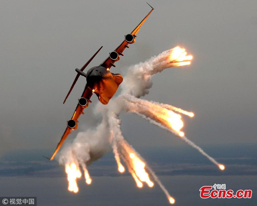 A C-17 Globemaster III releases flares over the Atlantic Ocean near Charleston, South Carolina, during a training mission, May 16, 2006. (Photo/VCG)