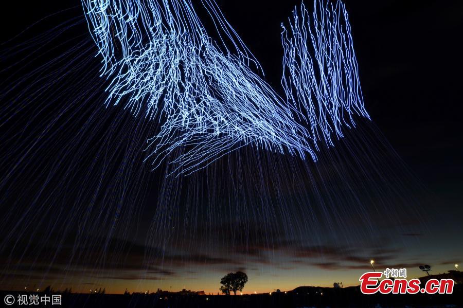 A view of Travis Air Force Base, Calif.'s Intel Shooting Star Drone light show where Travis families were shown the choreographed capabilities of over 500 drones during an Independence Day celebration July 5, 2018. The drones conducted a show consisting of various designs meant to highlight both the U.S. Air Force's and Travis' history. (Photo/VCG)