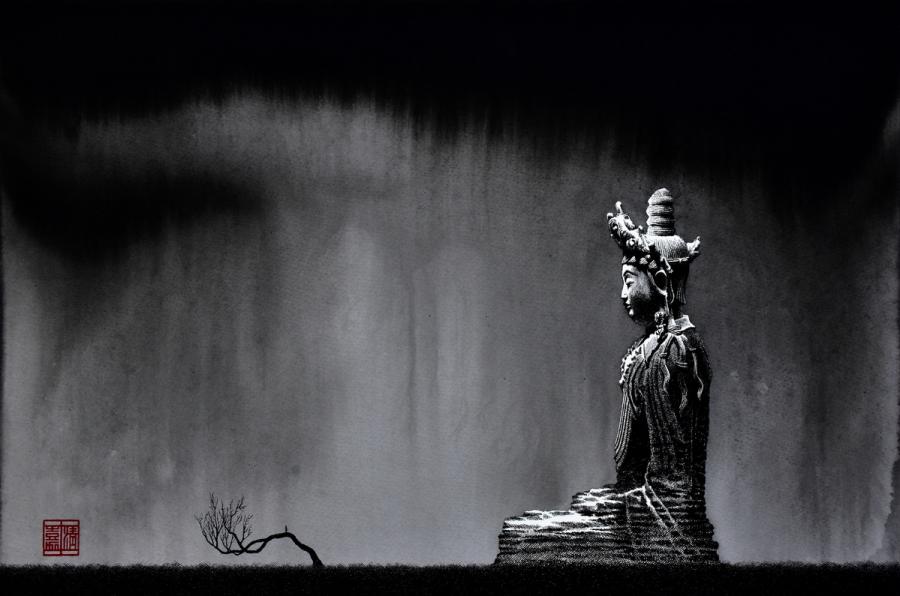 A 2017 pen-and-ink painting by Liu Kai shows a traditional Buddhist sculpture. (Photo provided to chinadaily.com.cn)