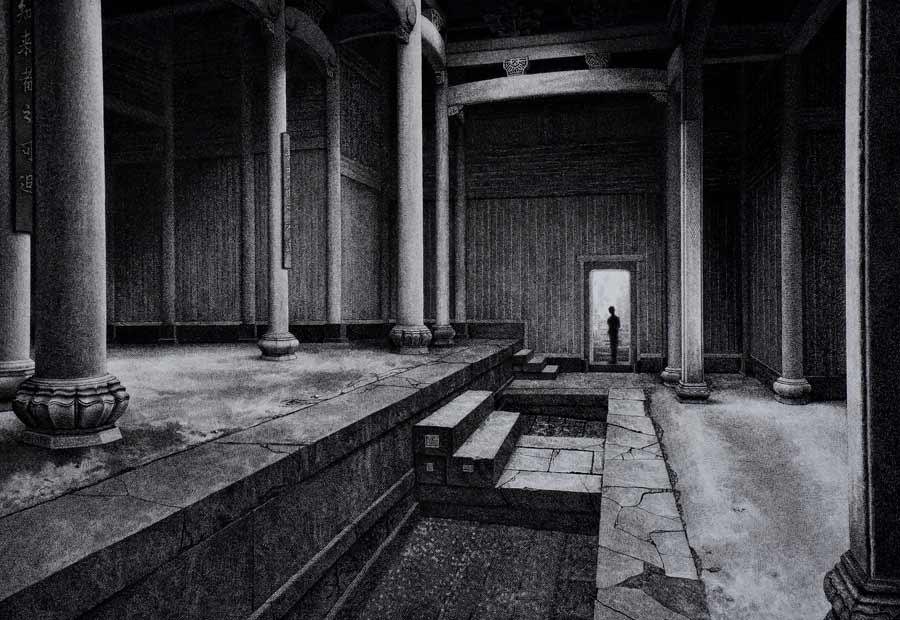 A 2016 pen-and-ink painting by Liu Kai shows the interior of a traditional Chinese building. (Photo provided to chinadaily.com.cn)