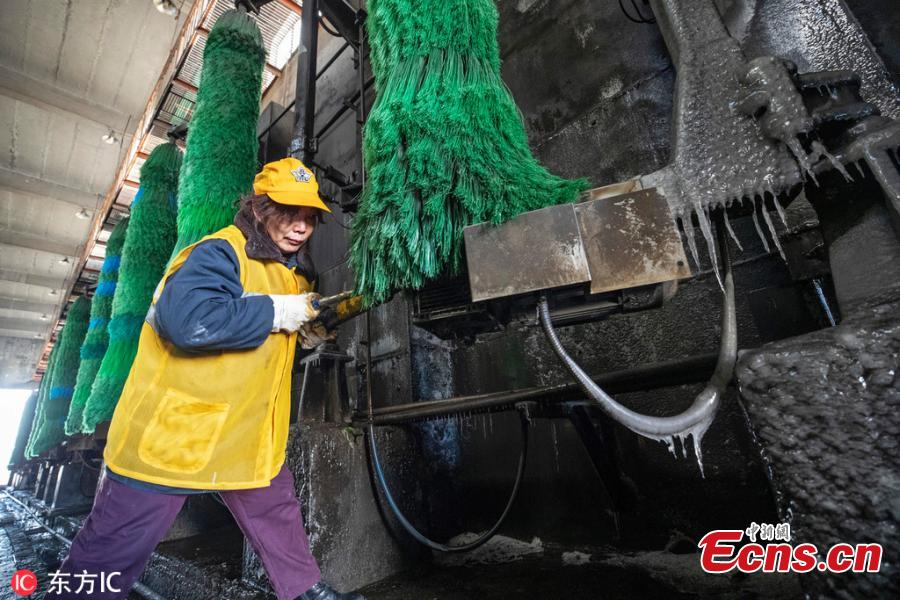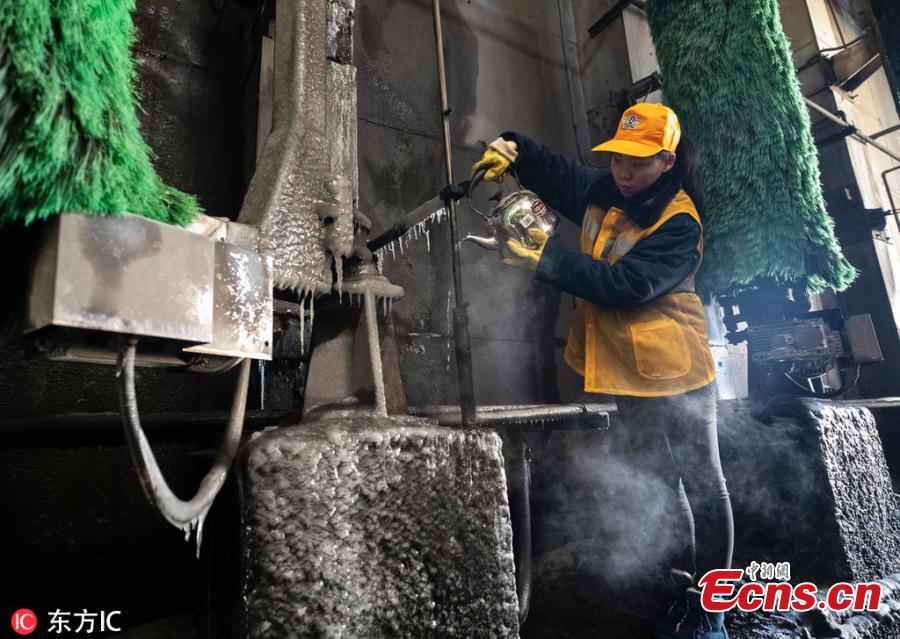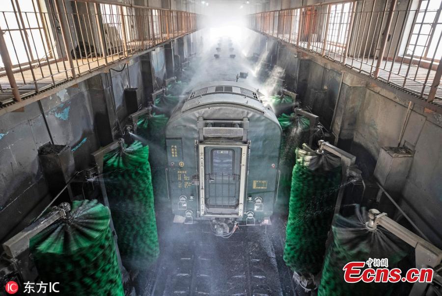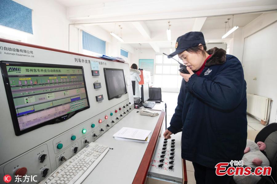 Female workers clean a train at a railway service station in Zhengzhou City, Central China's Henan Province. With an average age of 38 years, the workers in the cleaning unit are all female, with the exception of their male head. They are facing an increasing workload due to the Spring Festival travel rush, despite sub-zero temperatures. (Photo/IC)