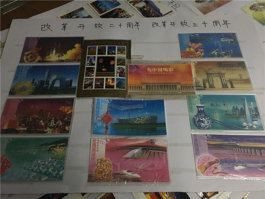 Part of Kong Xiangming's postcard collection, featuring China's reform and opening-up. (Photo/chinadaily.com.cn)