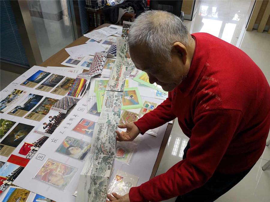 Kong Xiangming presents some of his postcards that record the 30th and 40th anniversaries of the founding of the People's Republic of China. (Photo/chinadaily.com.cn)