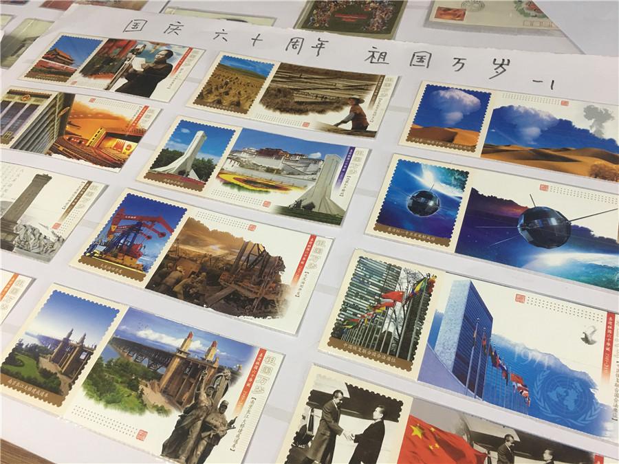 Part of Kong Xiangming's postcard collection, featuring the 60th anniversary of the founding of the People's Republic of China. (Photo/chinadaily.com.cn)