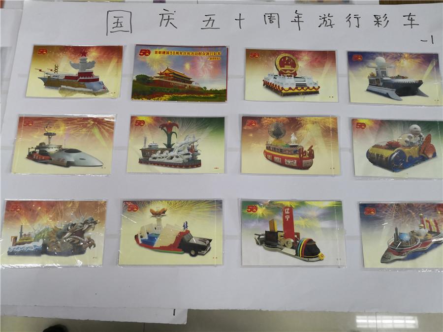 Part of Kong Xiangming's postcard collection, featuring the 50th anniversary of the founding of the People's Republic of China. (Photo/chinadaily.com.cn)