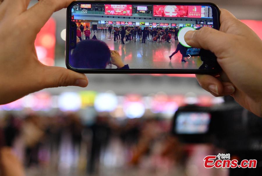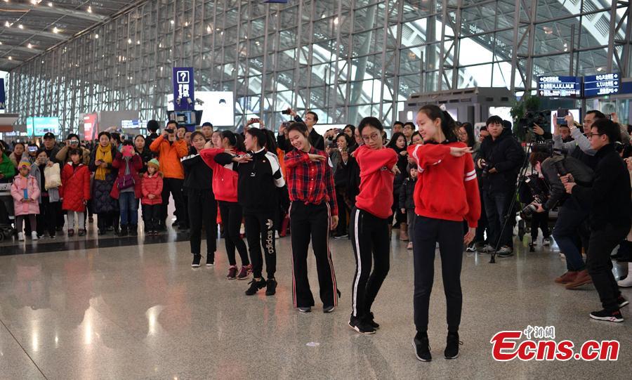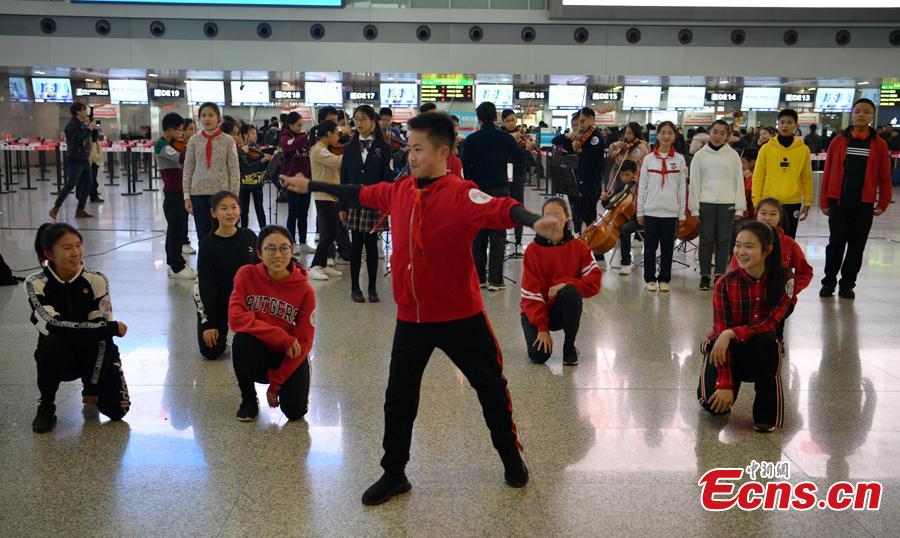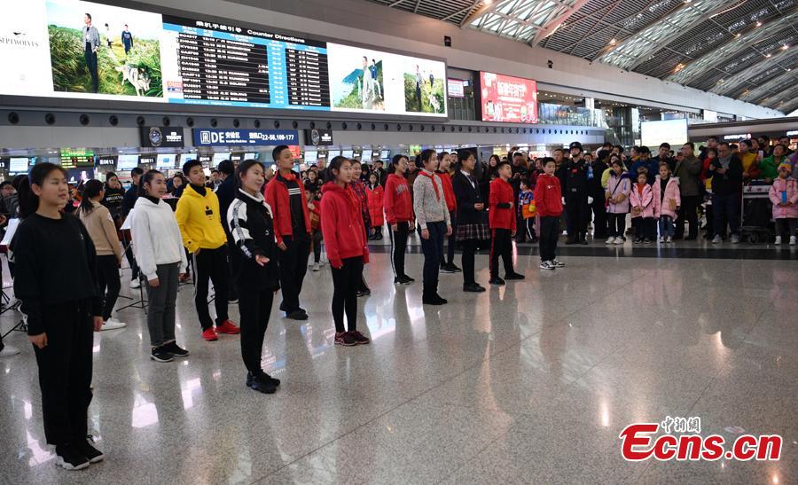 Students from St. Paul's Co-educational College in Hong Kong perform in a flash mob at the Terminal 2 of Shuangliu International Airport in Chengdu City, Sichuan Province, Jan. 27, 2019. (Photo: China News Service/Liu Zhongjun)