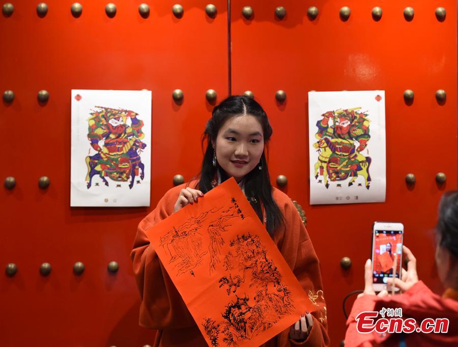 A woman shows a picture outside the Lao She Tea house in Beijing, where a Spring Festival paintings exhibition is being held, Jan. 27, 2019. The exhibition, organized by the Ministry of Culture and Tourism and Prince Gong's Mansion, presented representative traditional paintings of the Lunar New Year from across the country, and will run from Jan. 28 to Feb. 28. (Photo: China News Service/Hou Yu)
