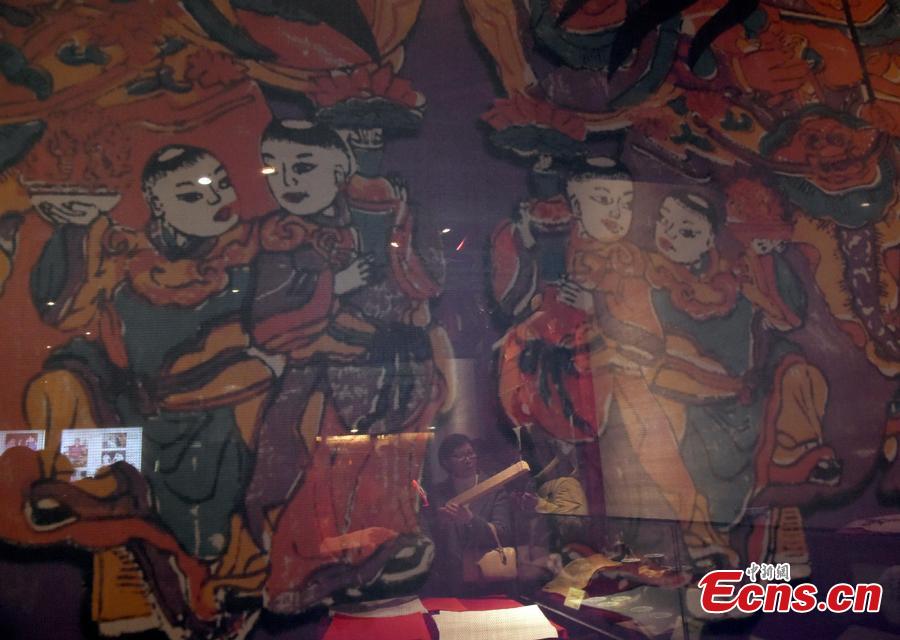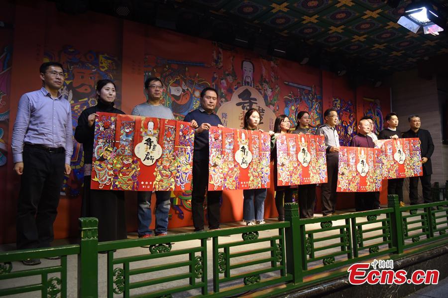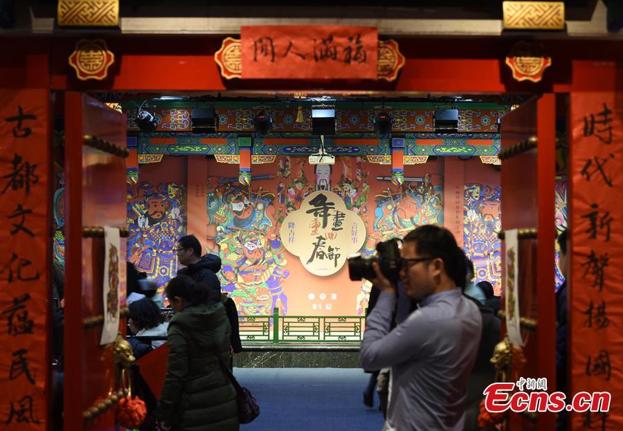 An exhibition of Spring Festival paintings is held at Lao She Tea house in Beijing, Jan. 27, 2019. The exhibition, organized by the Ministry of Culture and Tourism and Prince Gong's Mansion, presented representative traditional paintings of the Lunar New Year from across the country, and will run from Jan. 28 to Feb. 28. (Photo: China News Service/Hou Yu)