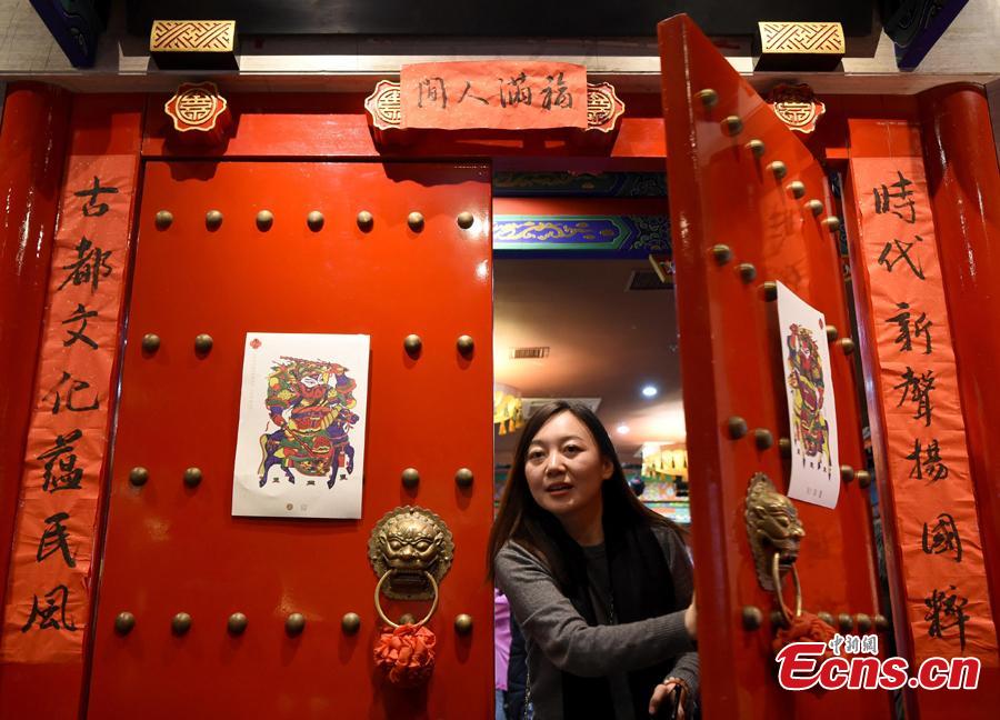 A woman walks out of the Lao She Tea house in Beijing, where a Spring Festival paintings exhibition is being held, Jan. 27, 2019. The exhibition, organized by the Ministry of Culture and Tourism and Prince Gong's Mansion, presented representative traditional paintings of the Lunar New Year from across the country, and will run from Jan. 28 to Feb. 28. (Photo: China News Service/Hou Yu)