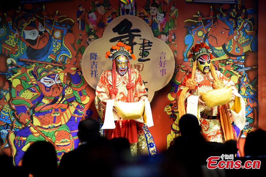 Visitors watch a performance during an exhibition of Spring Festival paintings held at Lao She Tea house in Beijing, Jan. 27, 2019. The exhibition, organized by the Ministry of Culture and Tourism and Prince Gong's Mansion, presented representative traditional paintings of the Lunar New Year from across the country, and will run from Jan. 28 to Feb. 28. (Photo: China News Service/Hou Yu)