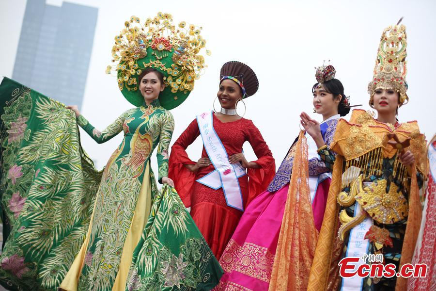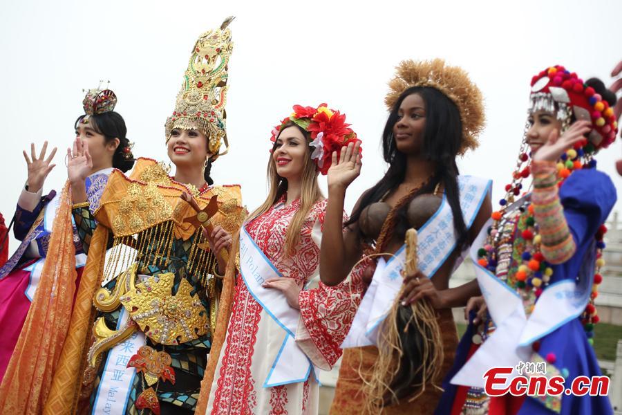 Contestants of Miss All Nations Pageant pose for photo in Nanjing, east China's Jiangsu Province, Jan. 29, 2019. The annual event is held to promote Eco-Tourism. Beauties from 42 countries and regions will compete at the annual pageant. (Photo: China News Service/Yang Bo)