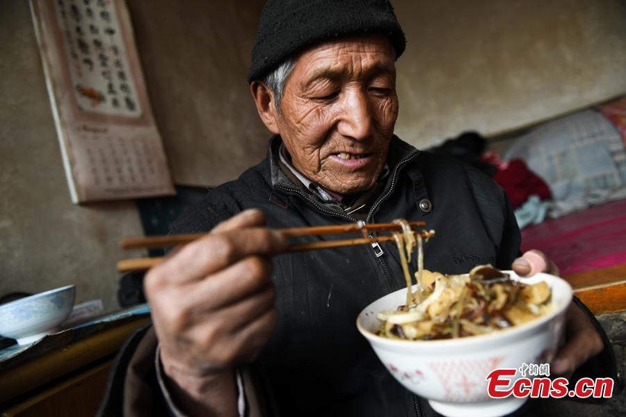 Li Tieliang, 69, has his lunch before returning to work as an extra in a TV drama being shot in Beishanyun Village in Yushe County, North China’s Shanxi Province, Jan. 24, 2019. The village has more than 30 well-preserved buildings from the Ming and Qing dynasties, making it a good location to shoot historical film and TV dramas. In recent years, many locals have migrated to other places, while some remaining farmers have found work as extras. Li and his wife survive by farming, while their children work in other cities. Li now works part-time as an extra and earns about 100 yuan ($14) a day. (Photo: China News Service/Wu Junjie)