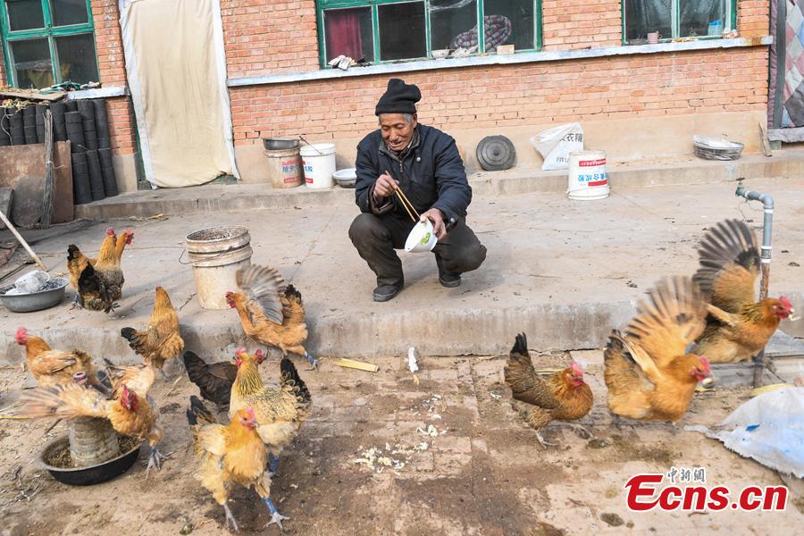 Li Tieliang, 69, feeds hens before returning to work as an extra in a TV drama being shot in Beishanyun Village in Yushe County, North China’s Shanxi Province, Jan. 24, 2019. The village has more than 30 well-preserved buildings from the Ming and Qing dynasties, making it a good location to shoot historical film and TV dramas. In recent years, many locals have migrated to other places, while some remaining farmers have found work as extras. Li and his wife survive by farming, while their children work in other cities. Li now works part-time as an extra and earns about 100 yuan ($14) a day. (Photo: China News Service/Wu Junjie)