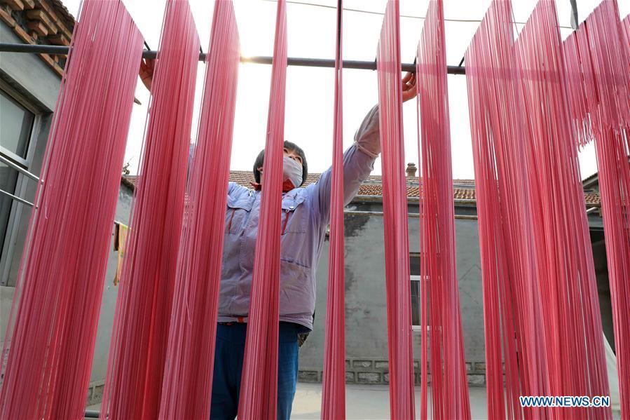 A staff member airs colored noodles at a workshop in Binzhou, east China's Shandong Province, Jan. 29, 2019. These noodles are naturally colored using vegetables or fruits such as carrot, spinach and dragon fruit. (Xinhua/Zhang Chunfeng)