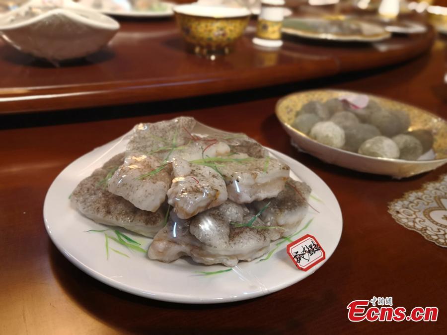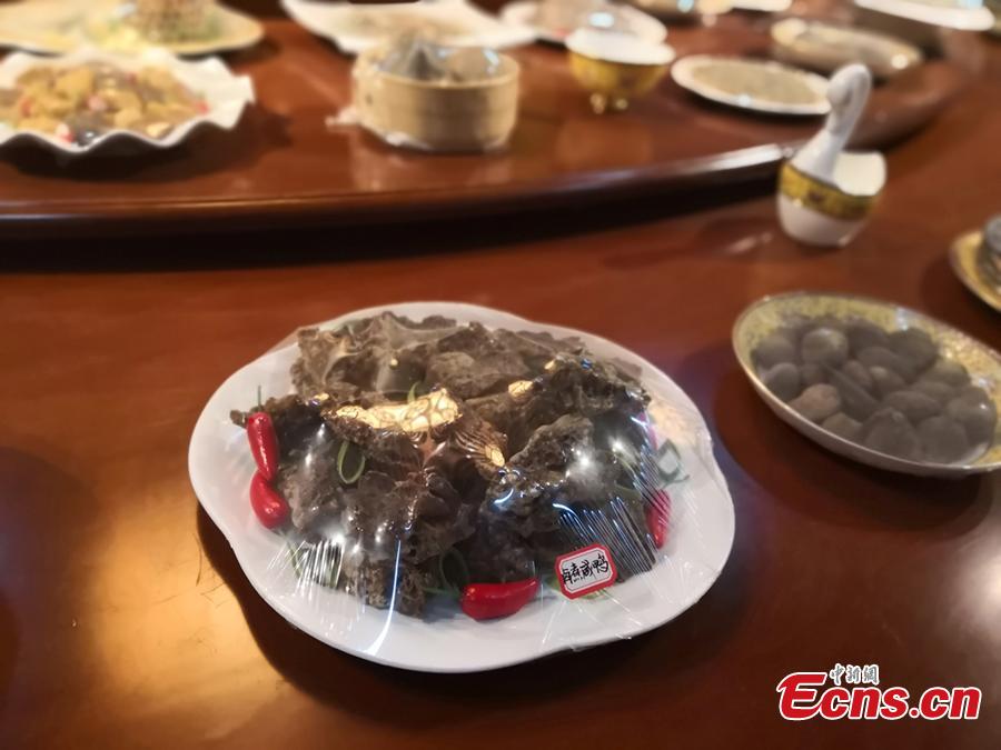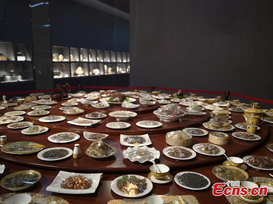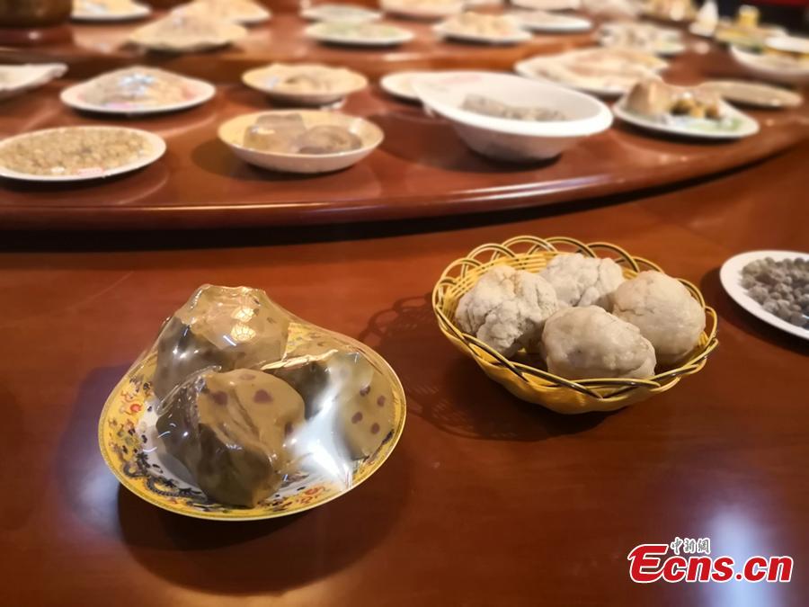 A "140-dish banquet" made of stones chosen from Taohe River is on display at the Rare Stone Museum in Dingxi, Gansu Province, Jan. 29, 2019. (Photo: China News Service/Yang Na)