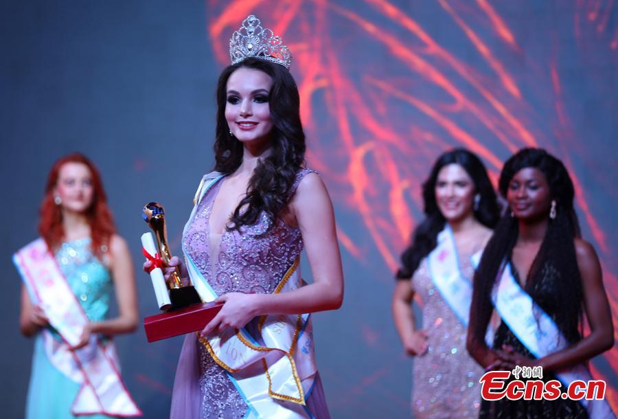 The contestant from Russia poses after winning first place in the world final of the 53rd Miss All Nations in Nanjing City, Jiangsu Province, Jan. 29, 2019. The pageant with the theme of eco-tourism included components of evening dress, bikini and national costumes. Participants from Russia, Mexico and Vietnam won the top three places. (Photo: China News Service/Yang Bo)