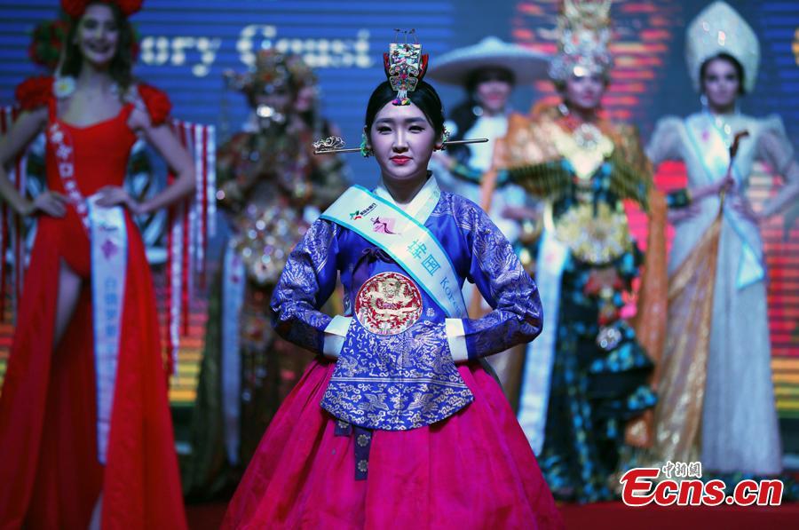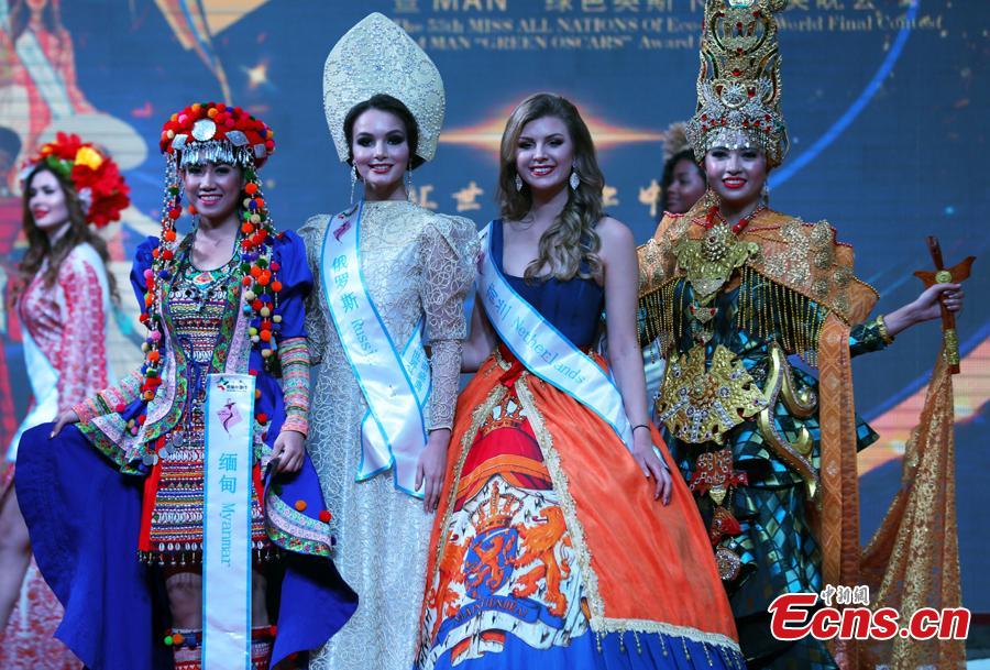 A participant competes in the world final of the 53rd Miss All Nations in Nanjing City, Jiangsu Province, Jan. 29, 2019. The pageant with the theme of eco-tourism included components of evening dress, bikini and national costumes. Participants from Russia, Mexico and Vietnam won the top three places. (Photo: China News Service/Yang Bo)