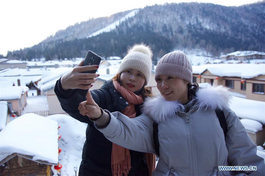 Tourists take selfie at the snow-covered Shuangfeng Forest Farm in Mudanjiang City, northeast China's Heilongjiang Province, Jan. 31, 2019. The Shuangfeng Forest Farm witnesses frequent snowfalls and is covered with snow for most of the year. The beautiful snow scenery here attracts many visitors from at home and abroad every year. (Xinhua/Yang Siqi)