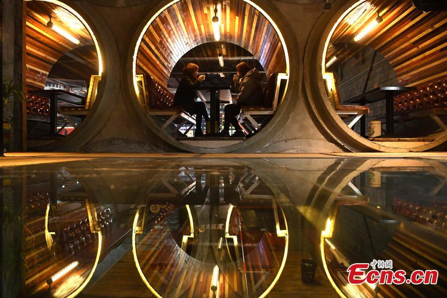 Photo taken on Feb. 1, 2019 in Chongqing's Liangjiang New Area shows the decor of a café featuring cement pipes and local dialects. (Photo: China News Service/Chen Chao)