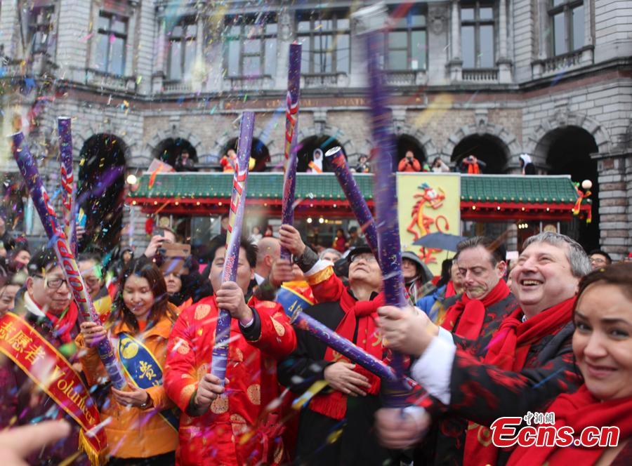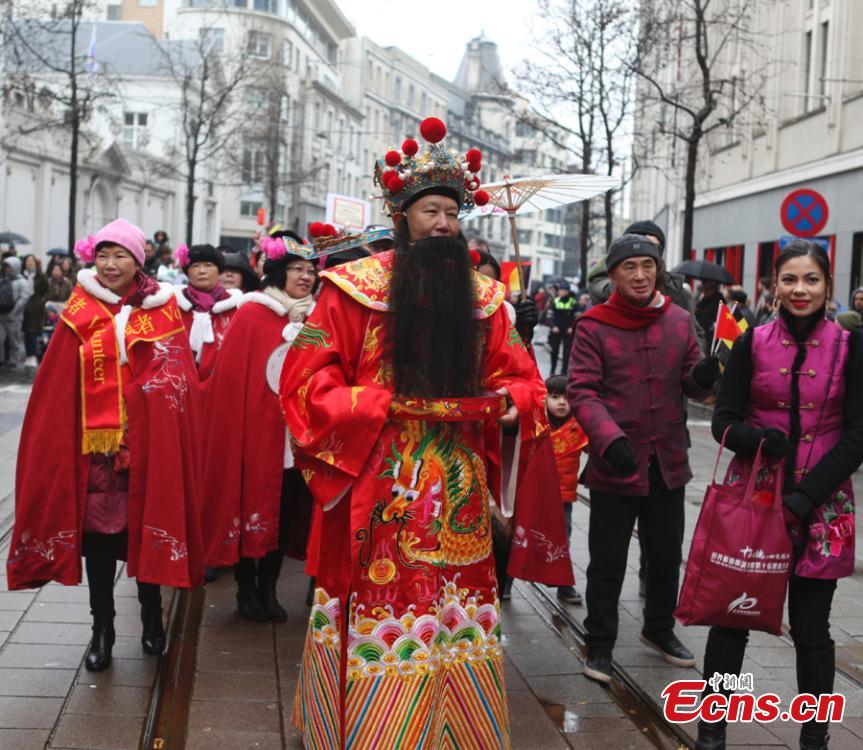 People celebrate the Spring Festival, Chinese Lunar New Year, which falls on Feb. 5 this year, during a parade in Antwerp, the second largest city of Belgium after Brussels, Feb. 2, 2019. (Photo: China News Service/De Yongjian)