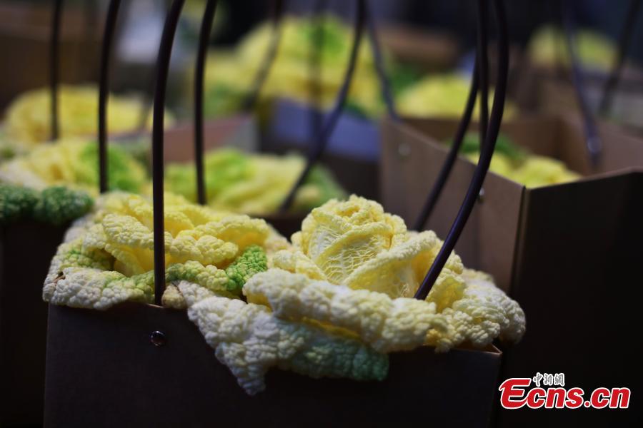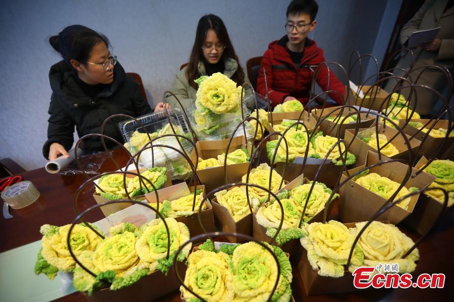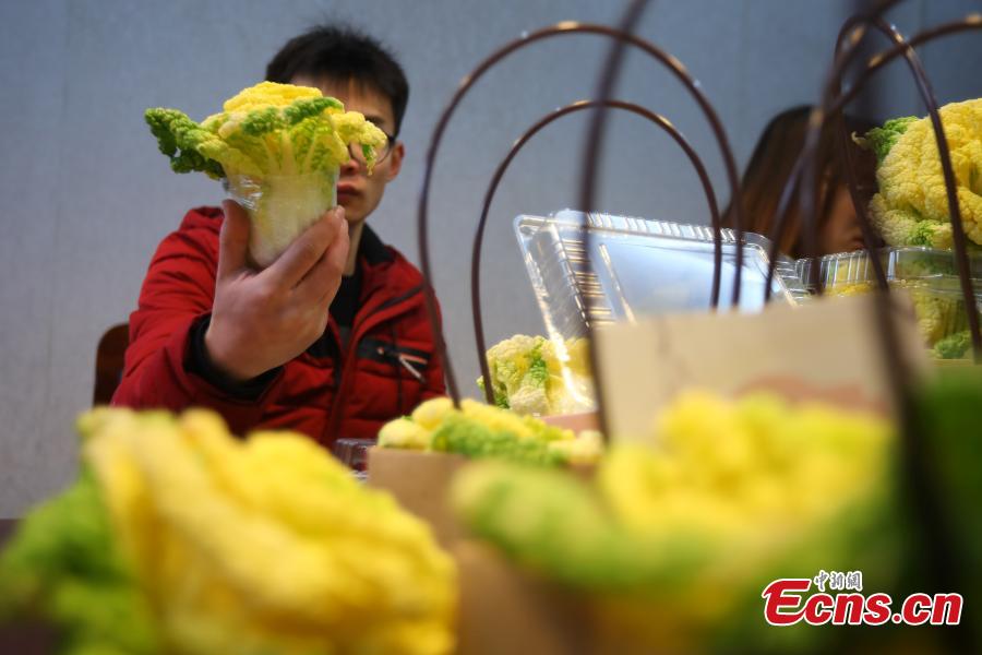 Students package a new breed of Chinese cabbage, developed by Professor Hou Xilin, at the College of Horticulture, Nanjing Agricultural University, Feb. 13, 2019. Students have launched a start-up to market the Chinese cabbage, which is smaller in size, rose-shaped and better tasting, both online and offline. (Photo: China News Service/Yang Bo)