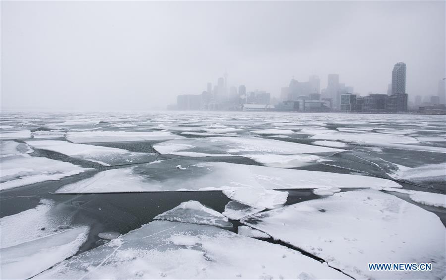 Toronto skyline is seen with floating ice on Lake Ontario in Toronto, Canada, on Feb. 13, 2019. A winter storm of a mix of snow, freezing rain and strong winds hit the Greater Toronto Area from Tuesday to Wednesday. (Xinhua/Zou Zheng)