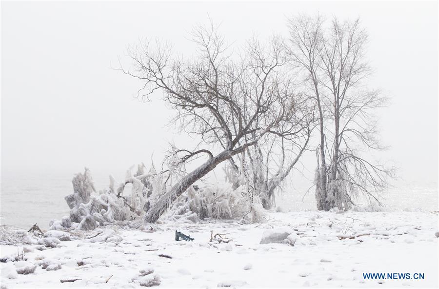 Ice-covered trees are seen near Lake Ontario in Toronto, Canada, on Feb. 13, 2019. A winter storm of a mix of snow, freezing rain and strong winds hit the Greater Toronto Area from Tuesday to Wednesday. (Xinhua/Zou Zheng)