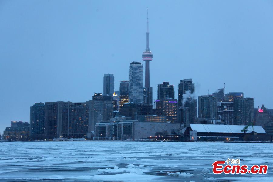 Toronto skyline is seen with floating ice on Lake Ontario in Toronto, Canada, on Feb. 13, 2019. A winter storm of a mix of snow, freezing rain and strong winds hit the Greater Toronto Area from Tuesday to Wednesday. (Photo/China News Service)