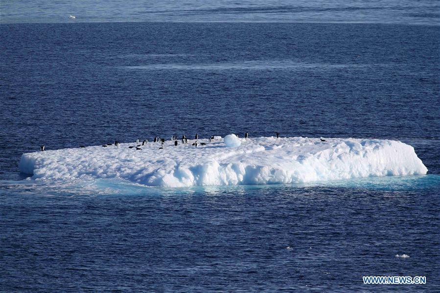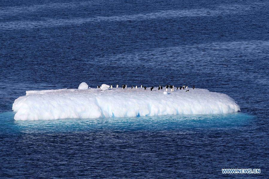 Photo taken on Feb. 15, 2019 shows penguins in the waters of Antarctica. China's research icebreaker Xuelong, with 126 crew members aboard on the 35th Antarctic research mission, on Thursday local time left the Zhongshan Station on its way back to China. It is expected to arrive in Shanghai in mid-March. (Xinhua/Liu Shiping)