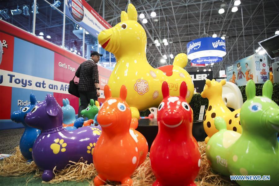 Colorful child's riding toys are displayed at the 116th Annual North American International Toy Fair at the Jacob K. Javits Convention Center in New York, the United States, Feb. 16, 2019. The toy fair, held from February 16 to 19 this year, gathered more than 1,000 toy exhibitors and hundreds of thousands of toys and youth entertainment products to retail outlets and trade guests from over 100 countries and regions. (Xinhua/Wang Ying)