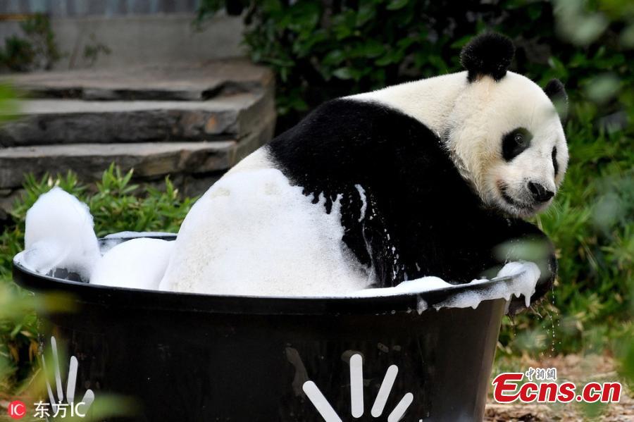 Giant panda Wang Wang plays with water at the Adelaide Zoo, Australia, Feb. 17, 2019. (Photo/IC)