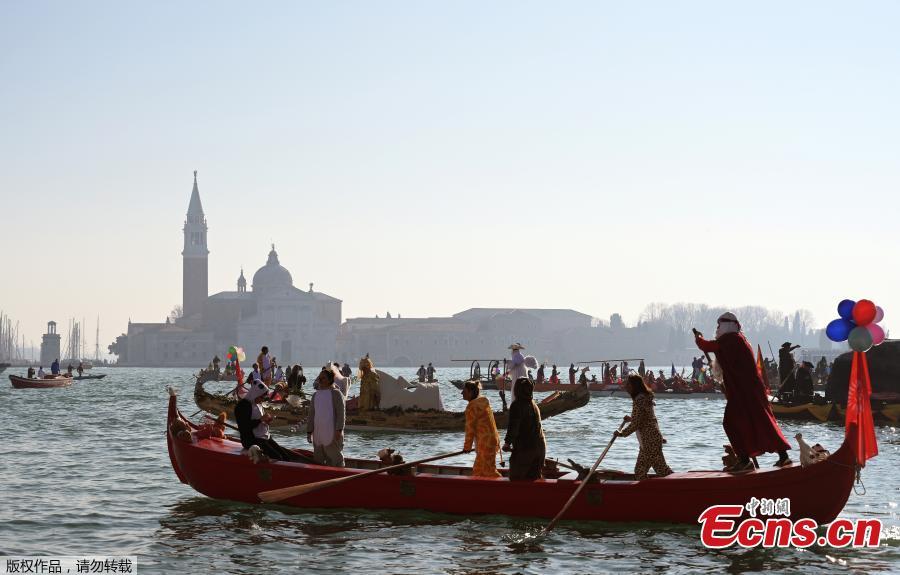 Venetians row during the masquerade parade on the Grand Canal during the Carnival in Venice, Italy, Feb. 17, 2019. Spectators lined the canal as elaborately decorated boats, accompanied by music, made their way down the waterway. (Photo/Agencies)