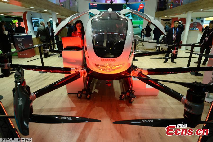 A flying vehicle on display at the Mobile World Congress in Barcelona, Spain, Feb. 26, 2019. The annual Mobile World Congress (MWC) runs from 25-28 February in Barcelona, where companies from all over the world gather to share new products. (Photo/Agencies)
