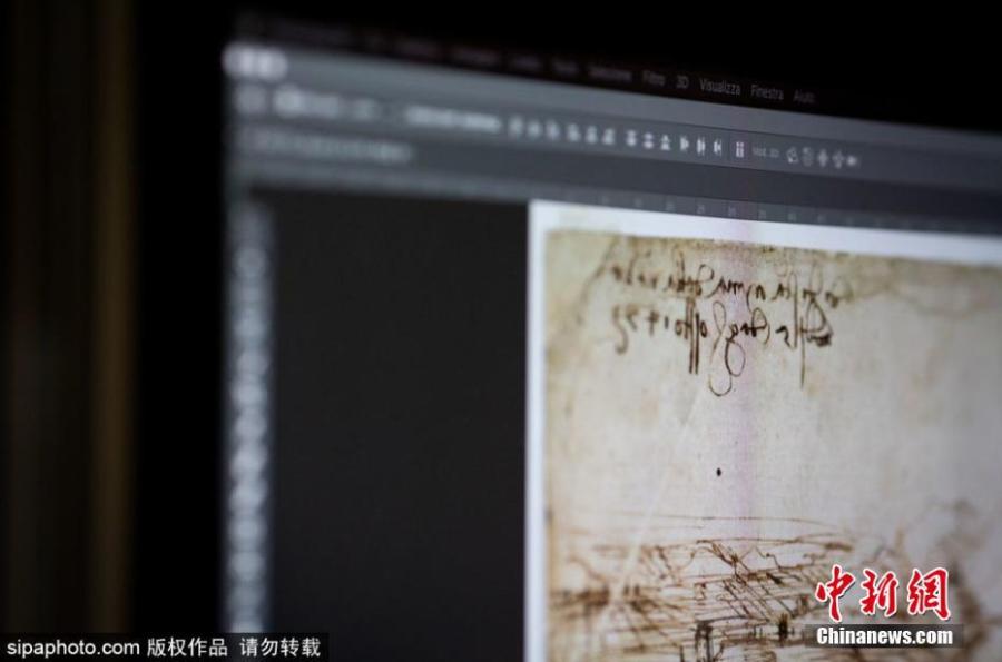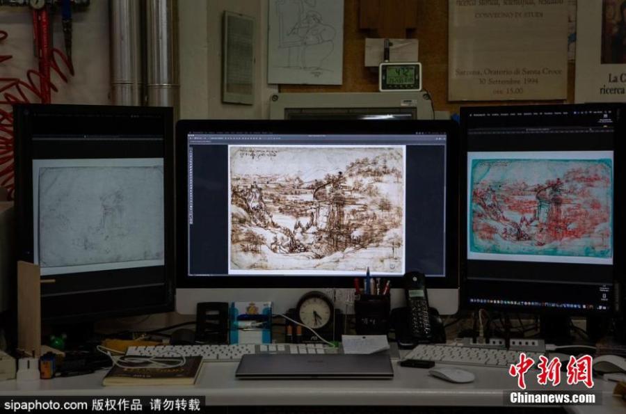 The landscape drawing for Santa Maria della Neve, attributed to Leonardo da Vinci on Aug. 5, 1473, is under scientific analyses in Florence, Italy. Aided by sophisticated, non-invasive instruments, such as infrared light, the experts on Thursday scrutinized the front of the drawing. The first-ever scientific study of a Leonardo drawing done in his youth shows the artist added details to earlier sketch. (Photo/Agencies)