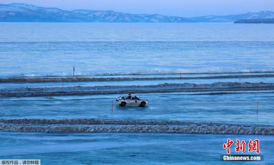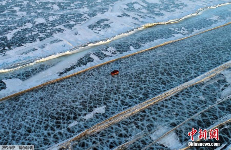 A car drives on the frozen surface of the Yenisei River, which looks like a spider web, in southern Krasnoyarsk, Russia, March 3, 2019. (Photo/IC)