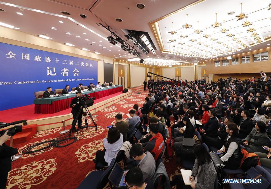 Li Wei, Qin Boyong, Chen Yulu, Wang Peian and Liu Bingjiang, members of the 13th National Committee of the Chinese People's Political Consultative Conference (CPPCC), attend a press conference on winning the three major battles of forestalling and defusing major risks, carrying out targeted poverty alleviation, and preventing and controlling pollution, for the second session of the 13th CPPCC National Committee in Beijing, capital of China, March 5, 2019. (Xinhua/Wang Peng)