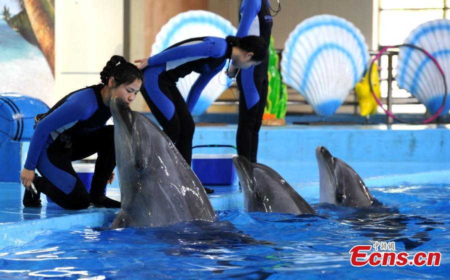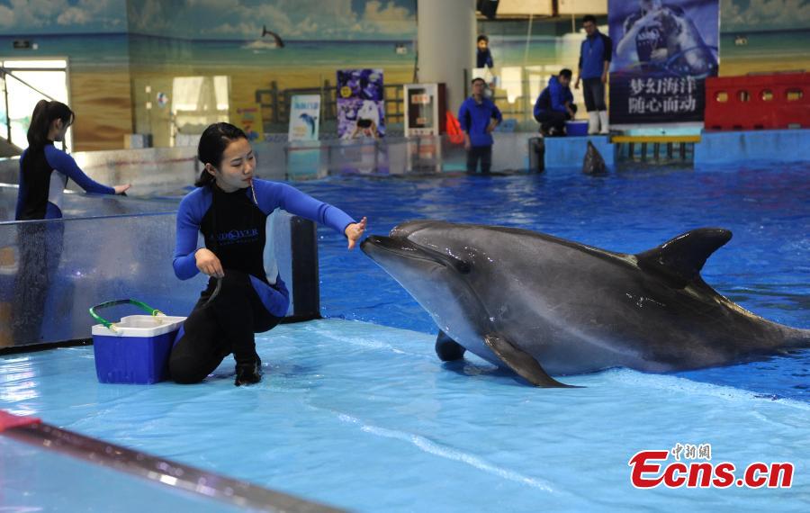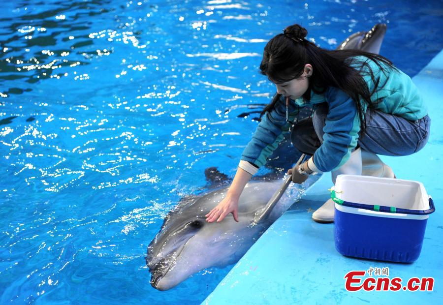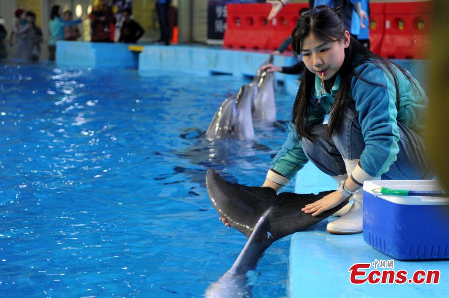 Trainer Sun Liru checks the health of a dolphin at an aquarium in Hefei City, Anhui Province, March 5, 2019. Sun said she chose the job because she has loved animals since she was a child. She has been training dolphins for four years. (Photo: China News Service/Han Suyuan)