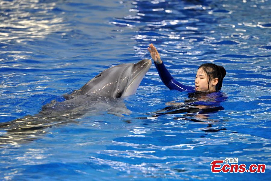 Trainer Sun Liru trains with a dolphin at an aquarium in Hefei City, Anhui Province, March 5, 2019. Sun said she chose the job because she has loved animals since she was a child. She has been training dolphins for four years. (Photo: China News Service/Han Suyuan)