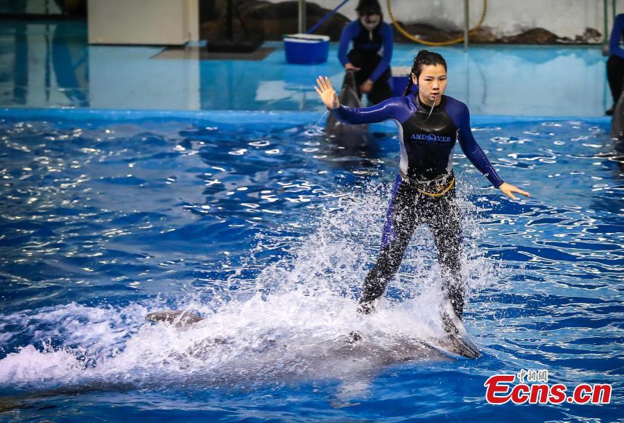 Trainer Sun Liru takes part in a dolphin show with colleagues at an aquarium in Hefei City, Anhui Province, March 5, 2019. Sun said she chose the job because she has loved animals since she was a child. She has been training dolphins for four years. (Photo: China News Service/Han Suyuan)