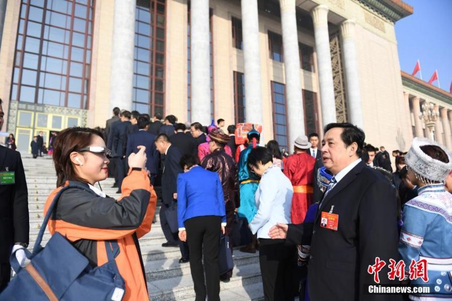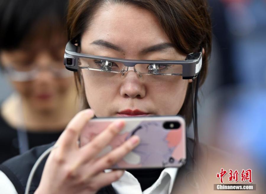 A reporter wears virtual reality (VR) glasses while covering the second session of the 13th National People's Congress at the Great Hall of the People in Beijing on Tuesday, March 5, 2019. The VR glasses can record the voice of the wearer, and the tiny camera installed on the frame of the glasses can capture high-definition videos. (Photo/China News Service)