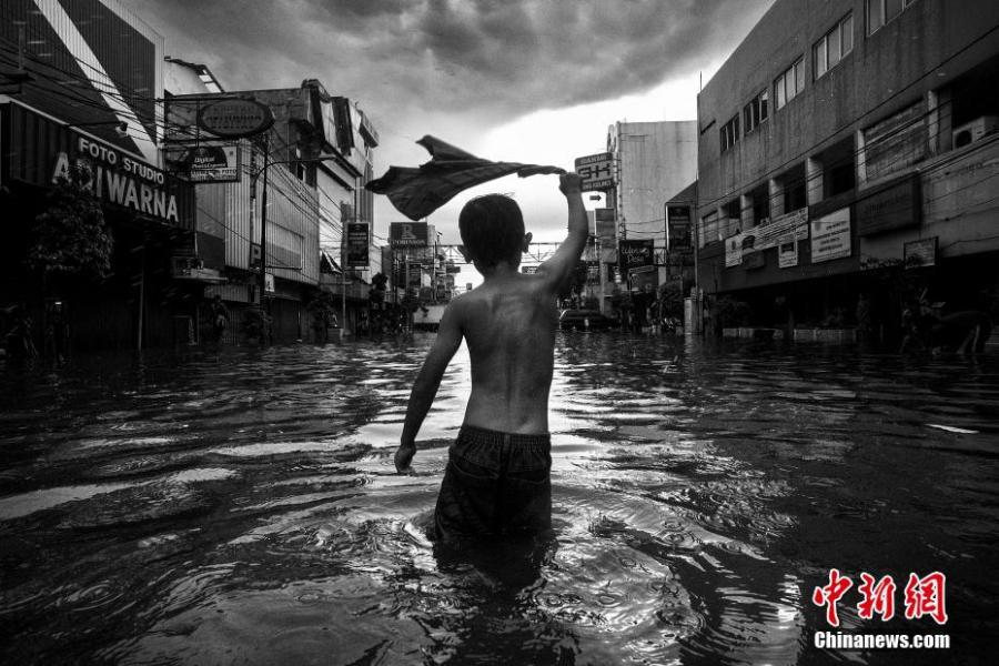 Photo taken by Fanny Octavianus shows a young boy plays in a street filled with water after heavy rains in Sabang, Central Jakarta. First winner in HIPA's 8th season Hope. (Photo/VCG)