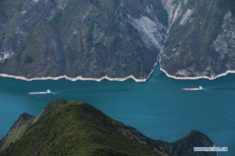 Ships sail in the Wuxia Gorge, one of the Three Gorges on the Yangtze River, in Wushan County, southwest China's Chongqing Municipality, March 26, 2019. (Xinhua/Wang Quanchao)