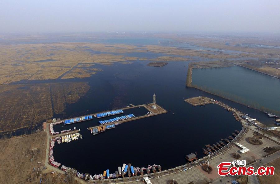 An aerial view of Baiyangdian Lake in Anxin County, Xiongan New Area, Hebei Province, March 27, 2019. In April 2017, China announced the establishment of the Xiongan New Area, spanning three counties in Hebei Province about 100 km southwest of Beijing. Many of Beijing's non-capital functions, as well as some of its population, will be relocated to Xiongan. (Photo: China News Service/Han Bing)